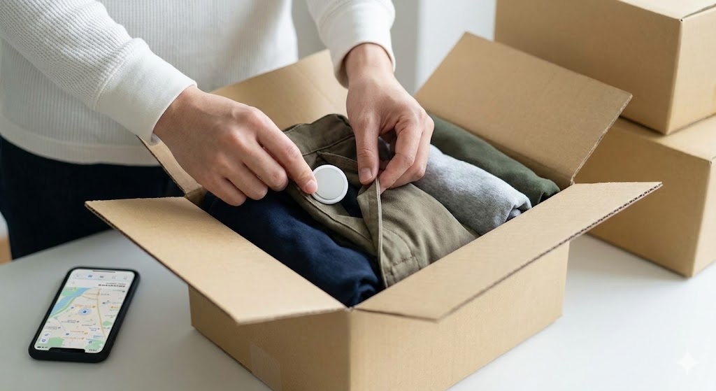 AirTag(エアタグ)などの「GPSタグ」を、高価な荷物や自転車の箱にこっそり入れておきましょう。これがあれば、荷物が今どこにあるかをスマホで確認できるからです。