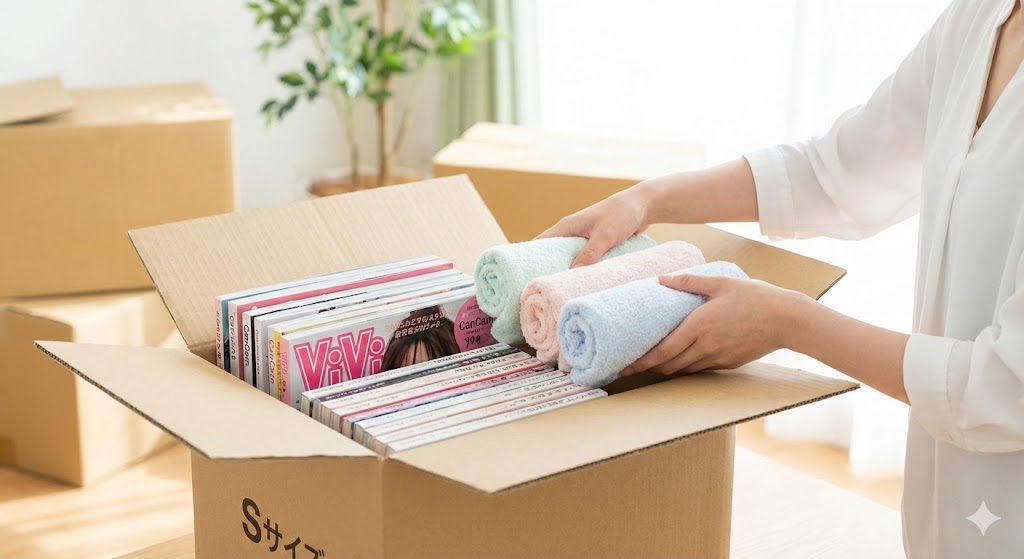本は必ず「Sサイズ(小)」へ。欲張って大きな箱に入れると、重さで底が抜けたり腰を痛めたりする原因になります。 - 隙間にはタオルを活用