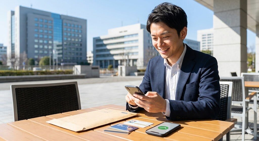 これがあれば、その後の銀行やクレジットカードの手続きがWebで完結できるようになるので、この順番で回るのが一番効率的なんです。