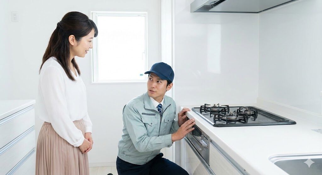 ガス漏れがないか、機械が正しく使えるか、作業員さんが家の中に入って点検する決まりが法律であるからです。