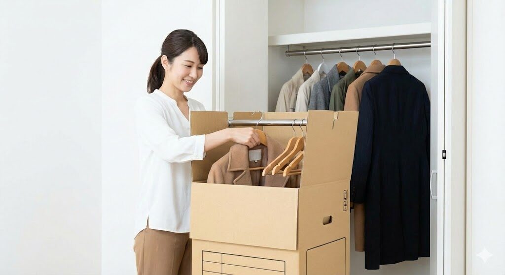 クローゼットにかかっているコートやワンピースを、ハンガーのまま移すだけで梱包が終わるからです。
