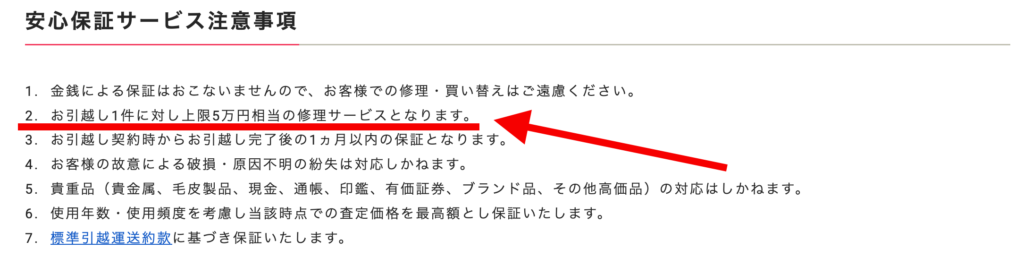 ただし、補償の上限は5万円相当までで、期間も引越完了後1ヵ月以内と短めです。高額品の全額補償を期待するものではなく、あくまで「小さいけど困るトラブル」への備えだと理解しておきましょう。