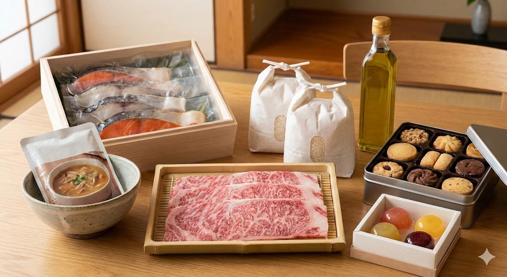 - 例:銀だら、鮭、鯖などの高級魚の詰め合わせ、老舗のレトルトスープ、銘柄牛のすき焼き肉など。