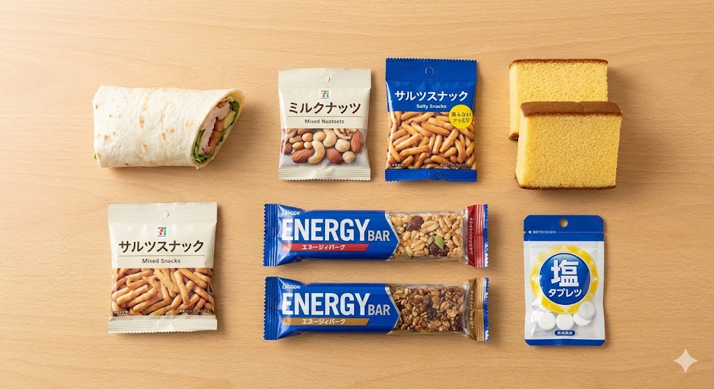 - 個包装のナッツ類や、塩気のあるお菓子(塩分補給ができる)