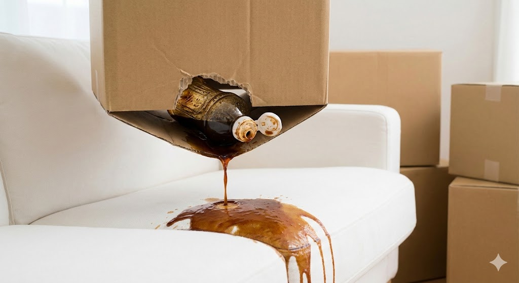 過去に、焼肉のタレが漏れてダンボールの底が抜け、その下にあった真っ白なソファにシミを作ってしまった…という悲しい事故がありました。液体は一度漏れると、周りの荷物までダメにしてしまう恐れがあります。