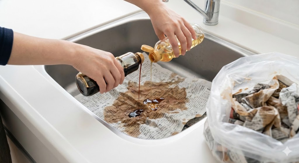 そのまま排水口に流すと、川や海を汚す原因になりますし、家の配管の中で油分と混ざって固まり、詰まりの原因にもなります。